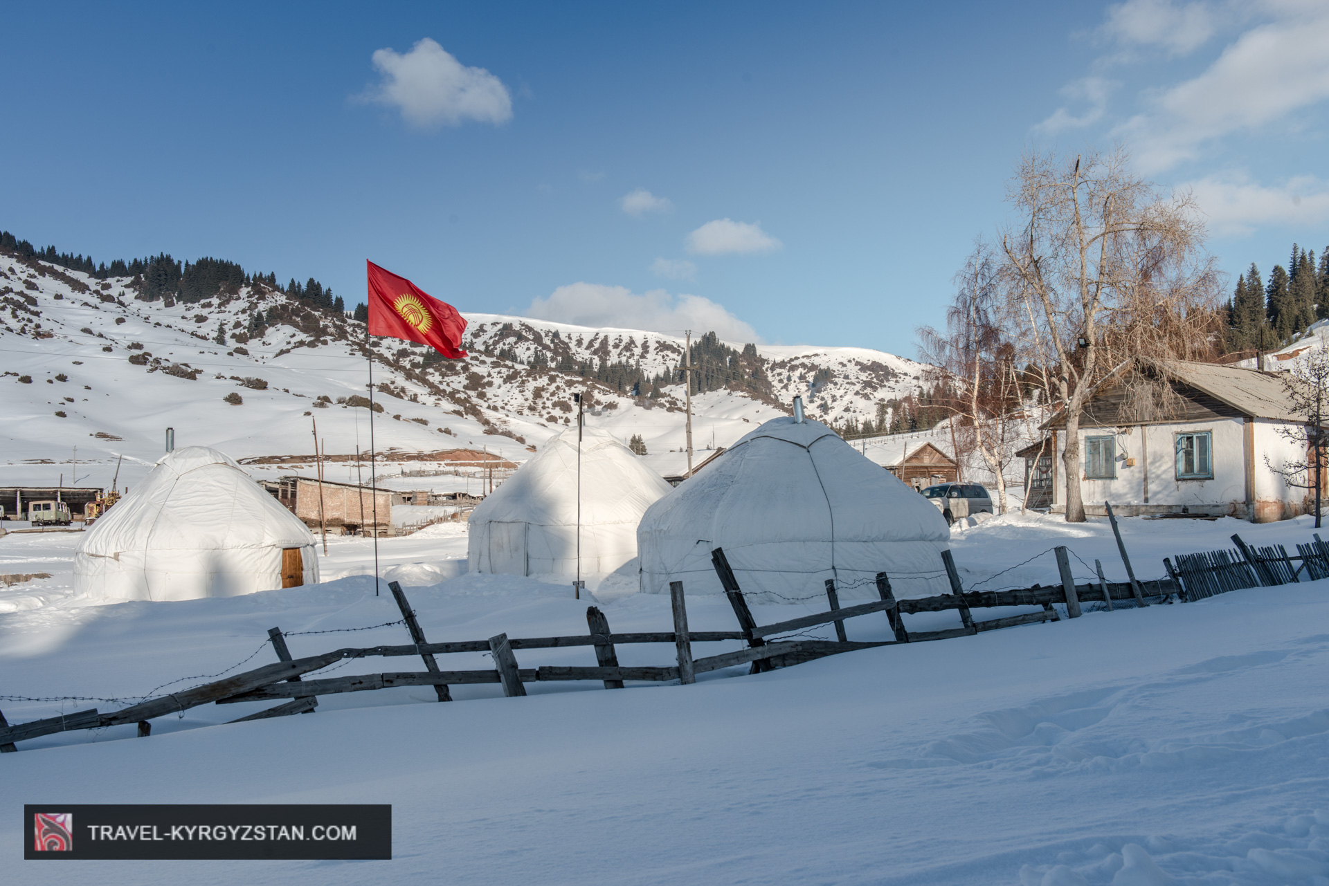 It is around 60km from Karakol village to the East. When entering the Jyrgalan village you will come to a road cross with a few signs (see image below) – you should turn left and follow around 200 meters.